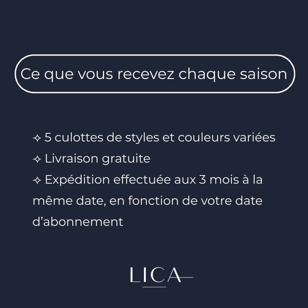 Les abonnements LICA vous permettent de recevoir automatiquement vos culottes préférées selon la fréquence choisie. Cette politique détaille le fonctionnement, les conditions d’expédition, la gestion des paiements et les modalités d’annulation.