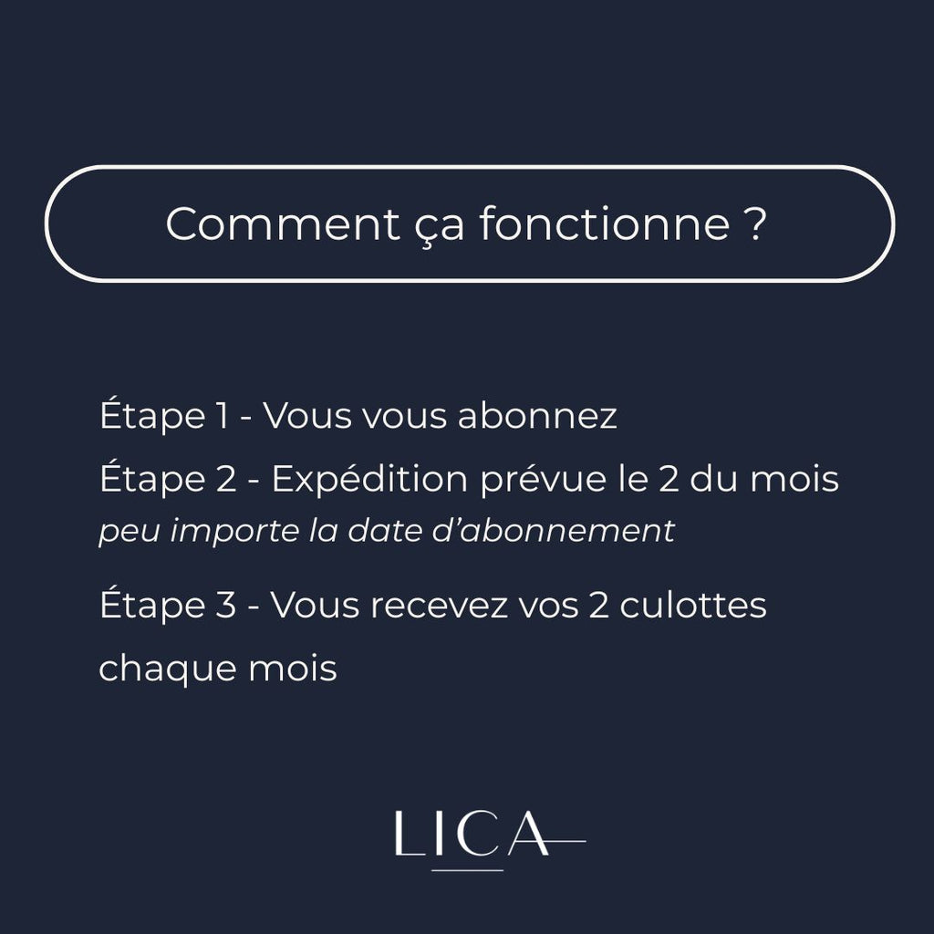 ⟢ 2 culottes par livraison, expédiées le 2 de chaque mois
